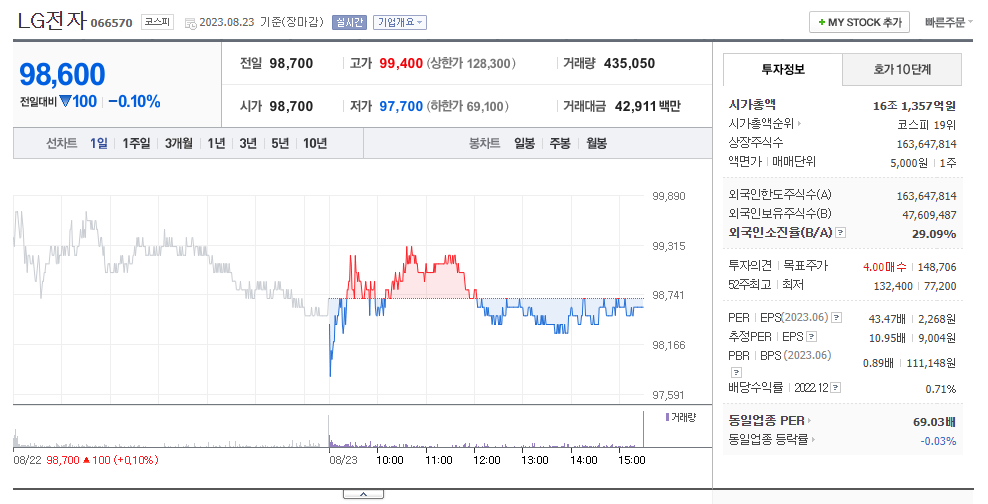 LG전자 현재 주가는 98,700원이며 전일 대비 -18.29원의 모습을 보이고 있습니다. LG전자의 주주현황을 살펴보면 LG(외 2인)이 지분 33.68%를 소유하고 있습니다. LG전자는 내구소비재 기업으로 장중 기준으로 주가는 98,700원 입니다. 삼성전자의 시가 총액은 16조1357억 원이며 발행 주식수는 29.09주 입니다. 외국인 보유 비중은 493,253% 이며 장중 거래량은 163,647,814를 기록했습니다. 매출액은 404,143억 원, 영업이익은 35,510억 원을 달성했습니다. EPS는 9,004원이며 LG전자 주식 배당수익률은 0.81% 입니다.