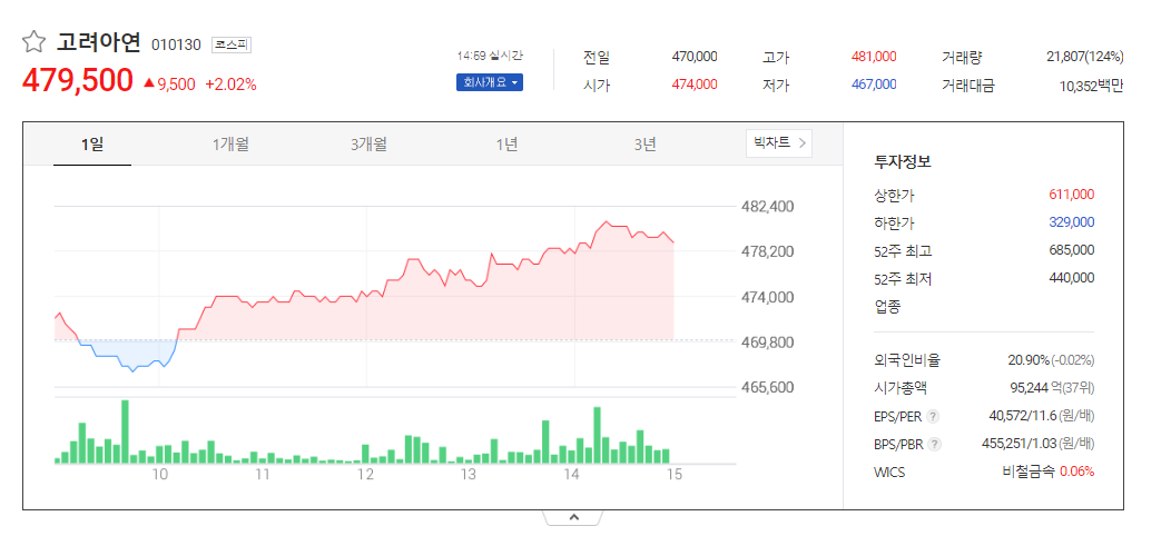 이 글에서는 고려아연 주가 전망과 목표 주가, 기업 정보에 대해서 설명합니다. 주식 거래에서 중요한 부분은 현재 기업 가치보다는 미래의 기업 가치를 예측하고 먼저 행동하는 것입니다. 투자할 종목을 고르기 전에 현재 기업의 상황과 지표를 살펴보는 것이 중요합니다. 고려아연 주식의 주요 현황과 투자 정보를 확인하시고 주식 투자에 도움을 줄 자료들을 모아 두었으니 투자 결정에 도움을 받으시길 바랍니다..