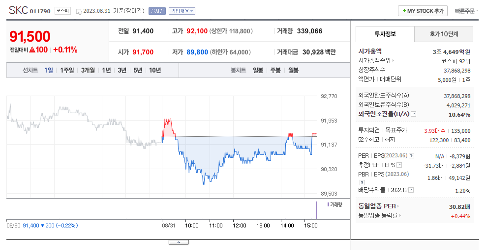 SKC 현재 주가는 91,400원이며 전일 대비 -200원의 모습을 보이고 있습니다. SKC의 주주현황을 살펴보면 SK(외 6인)이 지분 40.92%를 소유하고 있습니다. SKC는 화학 기업으로 장중 기준으로 주가는 91,400원 입니다. 삼성전자의 시가 총액은 3조4422억 원이며 발행 주식수는 10.64주 입니다. 외국인 보유 비중은 156,339% 이며 장중 거래량은 37,868,298를 기록했습니다. 매출액은 13,000억 원, 영업이익은 2,203억 원을 달성했습니다. EPS는 -2,884원이며 SKC 주식 배당수익률은 1.24% 입니다.