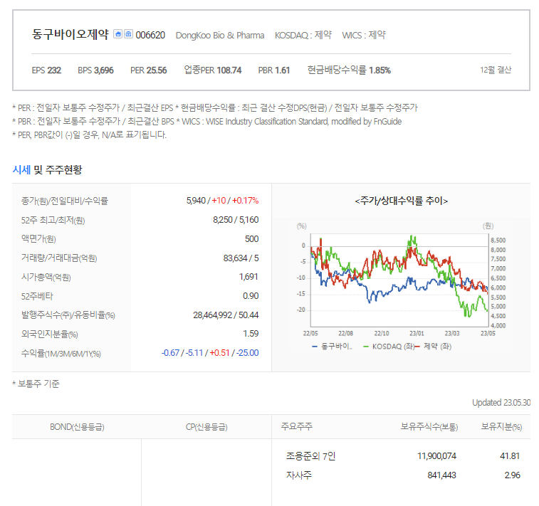 동구바이오제약 현재 주가는 5,980원이며 전일 대비 -110원의 모습을 보이고 있습니다. 동구바이오제약의 주주현황을 살펴보면 조용준(외 7인)이 지분 41.81%를 소유하고 있습니다. 동구바이오제약는 제약 기업으로 장중 기준으로 주가는 5,980원 입니다. 삼성전자의 시가 총액은 1714억 원이며 발행 주식수는 1.63주 입니다. 외국인 보유 비중은 75,493% 이며 장중 거래량은 28,464,992를 기록했습니다. 매출액은 1,950억 원, 영업이익은 81억 원을 달성했습니다.동구바이오제약 주식 배당수익률은 0.65% 입니다.