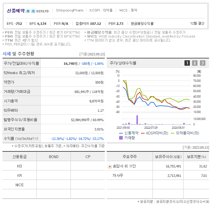 신풍제약 현재 주가는 16,740원이며 전일 대비 -180원의 모습을 보이고 있습니다. 신풍제약의 주주현황을 살펴보면 송암사(외 11인)이 지분 31.62%를 소유하고 있습니다. 신풍제약는 제약 기업으로 장중 기준으로 주가는 16,740원 입니다. 삼성전자의 시가 총액은 8796억 원이며 발행 주식수는 3.91주 입니다. 외국인 보유 비중은 681,941% 이며 장중 거래량은 52,984,990를 기록했습니다. 매출액은 1,015억 원, 영업이익은 -340억 원을 달성했습니다. EPS는 없음원이며 신풍제약 주식 배당수익률은 0.85% 입니다.