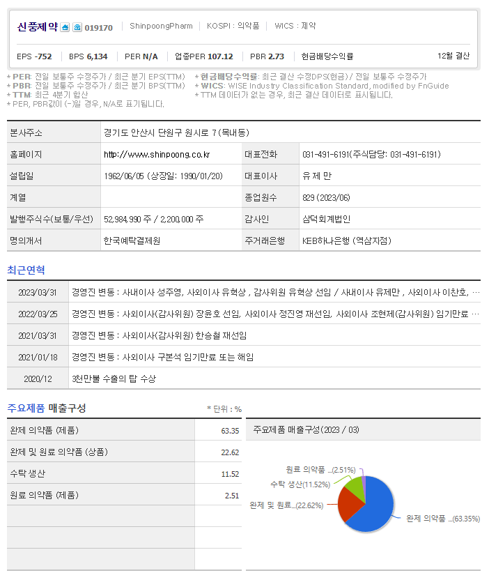 신풍제약는 제약 기업입니다. 대표자는 유제만 이며 설립일은 1962/06/05, 주식 상장일은 1990/01/20입니다. 전체 종업원 수는829명 이고 본사 주소는 경기도 안산시 단원구 원시로 7(목내동)입니다.