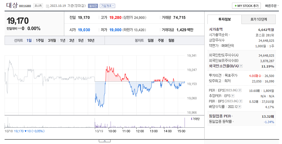 대상 현재 주가는 19,170원이며 전일 대비 -10원의 모습을 보이고 있습니다. 대상의 주주현황을 살펴보면 대상홀딩스(외 3인)이 지분 44.27%를 소유하고 있습니다. 대상는 식료품 기업으로 장중 기준으로 주가는 19,170원 입니다. 시가 총액은 6642억 원이며 발행 주식수는 11.20주 입니다. 외국인 보유 비중은 54,692% 이며 장중 거래량은 34,648,025를 기록했습니다. 매출액은 19,934억 원, 영업이익은 1,400억 원을 달성했습니다. EPS는 2,210원이며 대상 주식 배당수익률은 6,642% 입니다.