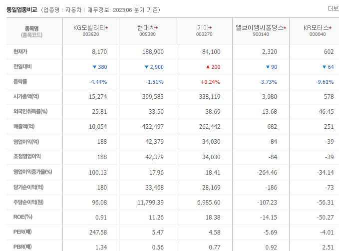 -2023년 6월 전년동기 대비 연결기준 매출액은 63.2% 증가, 영업이익은 13.1% 감소, 당기순이익은 70.4% 감소. 자동차부문 제외시 주력사업인 철강부문의 부진이 눈에 띄는 상황이며, 원가율 상승 및 비용 증가 여파로 수익성 또한 하락한 모습. 철강부문의 회복과 매출에서 비교적 큰 부분을 차지하고 있는 전자결제 부문에서의 성장 및 새롭게 추가된 자동차 성공여부가 향후 실적 개선의 포인트로 판단됨.