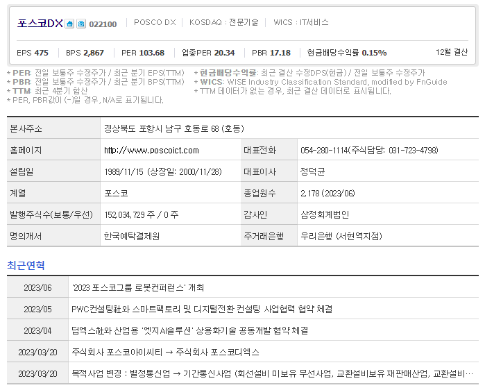 포스코DX는 IT 서비스 기업입니다. 대표자는 정덕균 이며 설립일은 1989/11/15, 주식 상장일은 2000/11/28입니다. 전체 종업원 수는2,178명 이고 본사 주소는 경북 포항시 남구 호동로 68입니다.