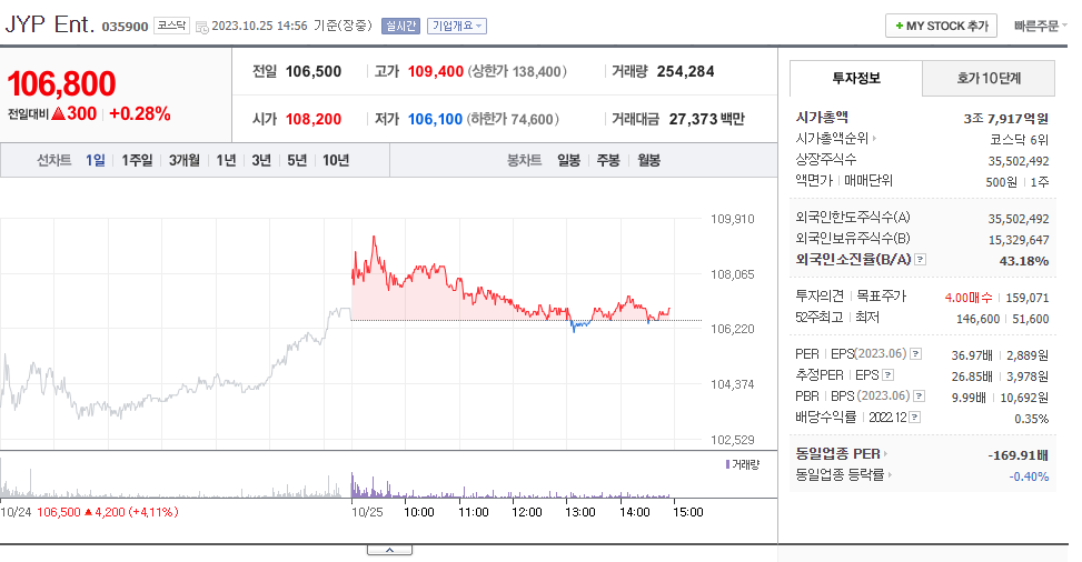 JYP Ent. 현재 주가는 106,500원이며 전일 대비 -17.44원의 모습을 보이고 있습니다. JYP Ent.의 주주현황을 살펴보면 박진영(외 3인)이 지분 15.79%를 소유하고 있습니다. JYP Ent.는 미디어 기업으로 장중 기준으로 주가는 106,500원 입니다. JYP Ent. 의 시가 총액은 3조7775억 원이며 발행 주식수는 43.18주 입니다. 외국인 보유 비중은 348,054% 이며 장중 거래량은 35,502,492를 기록했습니다. 매출액은 2,698억 원, 영업이익은 966억 원을 달성했습니다. EPS는 3,978원이며 JYP Ent. 주식 배당수익률은 37,810% 입니다.