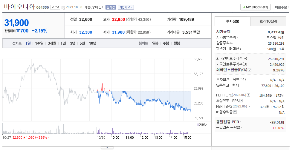 바이오니아 현재 주가는 32,600원이며 전일 대비 -7.12원의 모습을 보이고 있습니다. 바이오니아의 주주현황을 살펴보면 박한오(외 10인)이 지분 17.49%를 소유하고 있습니다. 바이오니아는 바이오 기업으로 장중 기준으로 주가는 32,600원 입니다. 바이오니아 시가 총액은 8233억 원이며 발행 주식수는 9.38주 입니다. 외국인 보유 비중은 195,434% 이며 장중 거래량은 25,810,291를 기록했습니다. 매출액은 1,254억 원, 영업이익은 115억 원을 달성했습니다.
