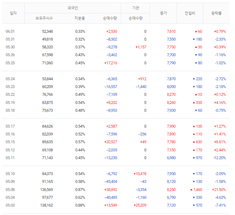 물론 가장 좋은 경우는 기관과 외국인 모두 매수하는 쌍끌이 종목을 살펴보는 방법입니다. 외국인과 기관이 동시에 매수한다는 뜻은 좋은 종목이라는 것을 의미합니다. 주가 전망을 알아보기 위해서는 자세한 기업의 정보를 살펴보고 시장 흐름에서의 위치를 알아봐야 합니다. 거기에 외국인과 기관 매수 흐름을 확인한다면 성공 확률을 올릴 수 있다고 생각합니다.