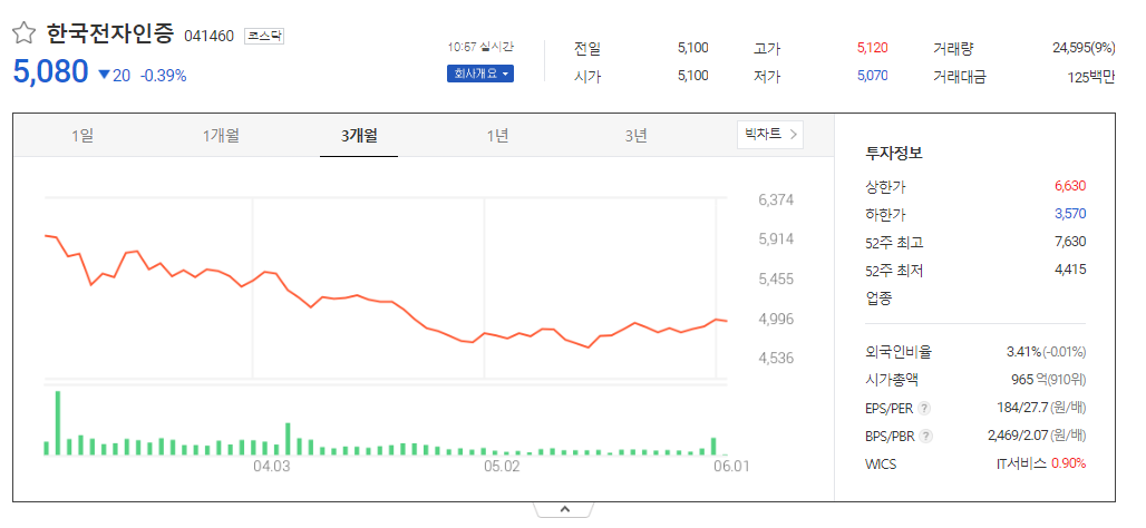 이 글에서는 한국전자인증 주가 전망과 목표 주가, 기업 정보에 대해서 설명합니다. 주식에 투자하기 전에는 정확한 기업 정보와 주가 현황에 대해 알아보는 것은 아주 중요합니다. 한국전자인증 주식의 주요 현황과 투자 정보를 확인하시고 지금 시장에서 위치를 파악해보겠습니다.