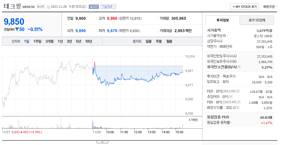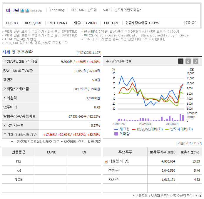 테크윙 현재 주가는 9,900원이며 전일 대비 원의 모습을 보이고 있습니다. 테크윙의 주주현황을 살펴보면 나윤성(외 3인)이 지분 13.33%를 소유하고 있습니다. 테크윙는 반도체 및 관련장비 기업으로 장중 기준으로 주가는 9,900원 입니다. 테크윙 시가 총액은 3679억 원이며 발행 주식수는 5.27주 입니다. 외국인 보유 비중은 809,748% 이며 장중 거래량은 37,353,645를 기록했습니다. 매출액은 924억 원, 영업이익은 577억 원을 달성했습니다. 테크윙 주식 배당수익률은 455,784% 입니다.