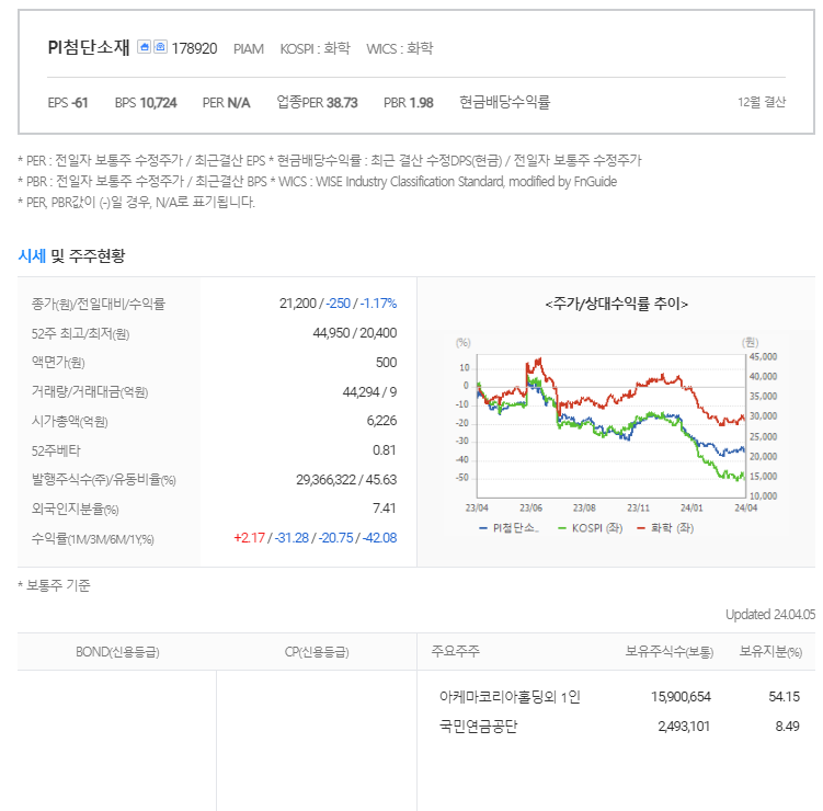 PI첨단소재 현재 주가는 21,200원이며 전일 대비 -250원의 모습을 보이고 있습니다. PI첨단소재의 주주현황을 살펴보면 아케마코리아홀딩 주주가 전체 지분 54.15%를 소유하고 있습니다. PI첨단소재는 화학 기업으로 장중 기준으로 주가는 21,200원 입니다. PI첨단소재의 시가 총액은 6094억 원이며 발행 주식수는 29,366,322주 입니다. 외국인 보유 비중은 7.41% 이며 장중 거래량은 44,294원 을 기록했습니다. 매출액은 2,176억 원을 달성했습니다. EPS는 927원입니다.