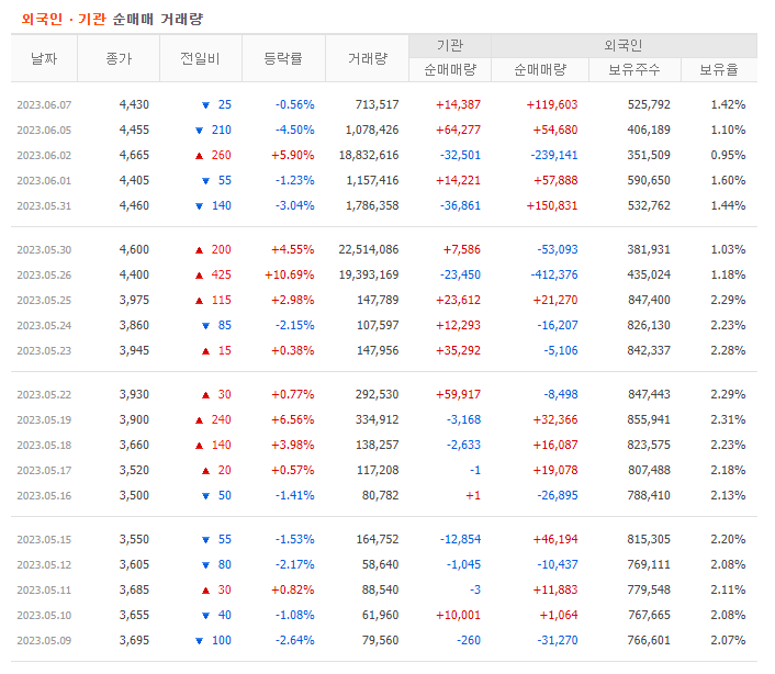 그래서 개인 투자 주체는 기관이나 외국인 투자자를 따라할 수 밖에 없습니다. 자본이 약한 개인 투자자는 이들이 무엇을 매수하고 매도하는지 잘 관찰하면 수익을 낼 수 있습니다. 최근에는 외국인보다는 기관 투자를 따라가는 경향이 강합니다. 외국인 세력은 속임수를 쓸 수 있고개인이 좋아하는 단기 투자에서는 기관투자를 따라가는 것이 맞기 때문입니다.