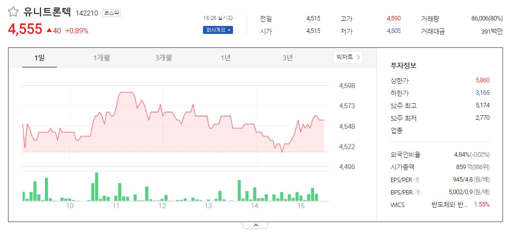 유니트론텍 현재 주가는 4,515원이며 전일대비 -5원의 모습을 보이고 있습니다. 유니트론텍의 주주현황을 살펴보면 남궁선(외 4인)이 지분 22.33%를 소유하고 있습니다. 유니트론텍는 반도체 및 관련장비 기업으로 장중 기준으로 주가는 4,515원 입니다. 삼성전자의 시가 총액은 856억 원이며 발행 주식수는 4.84주 입니다. 외국인 보유 비중은 107,199% 이며 장중 거래량은 18,854,715를 기록했습니다. 매출액은 1,271억 원, 영업이익은 309억 원을 달성했습니다. EPS는 없음원이며 유니트론텍 주식 배당수익률은 % 입니다.