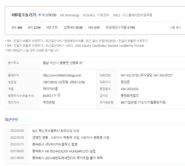HB테크놀러지는 디스플레이 및 관련부품 기업입니다. 대표자는 문성준 이며 설립일은 1997/09/02, 주식 상장일은 2004/12/08입니다. 전체 종업원 수는434명 이고 본사 주소는 충남 아산시 음봉면 산동로 87 (산동리 597-9)입니다.