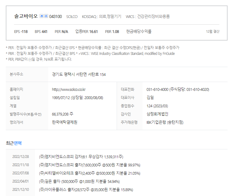 솔고바이오는 의료 장비 및 서비스 기업입니다. 대표자는 김일 이며 설립일은 1995/07/12, 주식 상장일은 2000/08/08입니다. 전체 종업원 수는124명 이고 본사 주소는 경기도 평택시 서탄면 서탄로 154입니다.