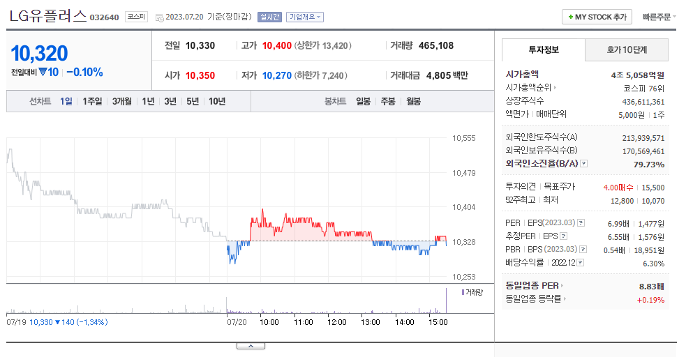 LG유플러스 현재 주가는 10,330원이며 전일 대비 -140원의 모습을 보이고 있습니다. LG유플러스의 주주현황을 살펴보면 LG(외 2인)이 지분 37.67%를 소유하고 있습니다. LG유플러스는 무선통신 기업으로 장중 기준으로 주가는 10,330원 입니다. 시가 총액은 4조5233억 원이며 발행 주식수는 39.07주 입니다. 외국인 보유 비중은 656,160% 이며 장중 거래량은 436,611,361를 기록했습니다. 매출액은 35,413억 원, 영업이익은 10,813억 원을 달성했습니다. EPS는 1,576원이며 LG유플러스 주식 배당수익률은 5.88% 입니다.