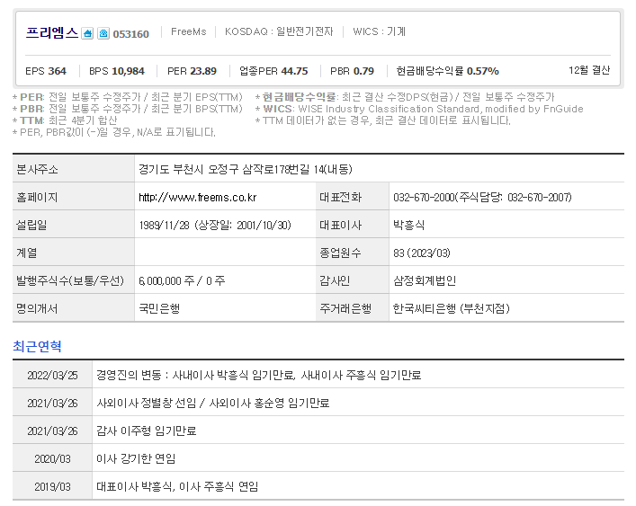 프리엠스는 기계 기업입니다. 대표자는 박흥식 이며 설립일은 1989/11/28, 주식 상장일은 2001/10/30입니다. 전체 종업원 수는83명 이고 본사 주소는 경기도 부천시 삼작로178번길 14(내동)입니다.
