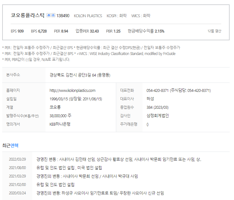 코오롱플라스틱는 화학 기업입니다. 대표자는 허성 이며 설립일은 1996/03/15, 주식 상장일은 2011/06/15입니다. 전체 종업원 수는384명 이고 본사 주소는 경북 김천시 공단3길 64 (응명동)입니다.