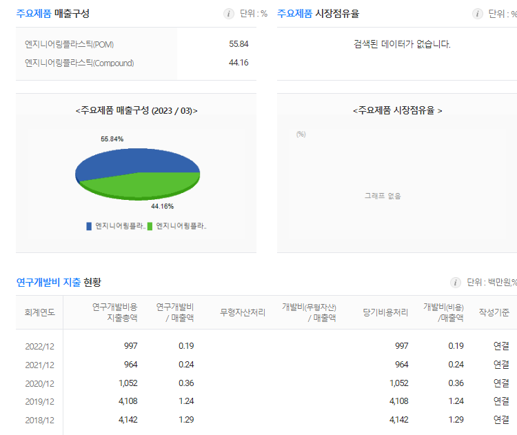 -2023년 3월 전년동기 대비 연결기준 매출액은 1.8% 감소, 영업이익은 6.6% 감소, 당기순이익은 17.7% 증가. 2023년 1분기 기준 POM은 매출액 68,002백만원(매출비율 55.8%), Compound 제품은 매출액 53,771백만원(매출비율 44.2%)을 기록함. 유럽법인과 인도법인, 미국법인, 중국법인 등을 비롯한 해외 사업장을 구축하여 시장을 확대해 나가고 있음.