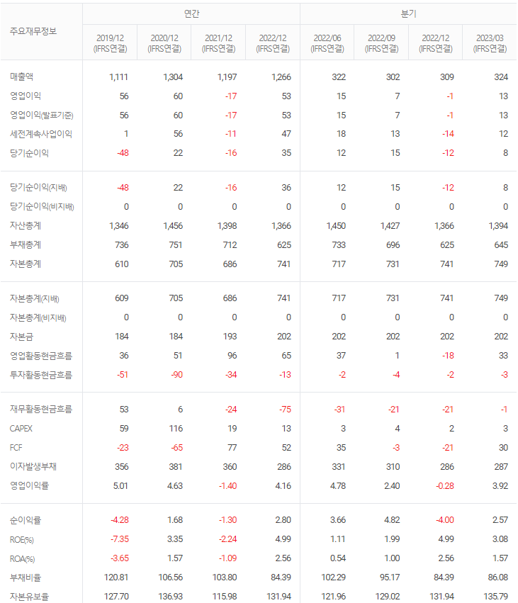 -2023년 3월 전년동기 대비 연결기준 매출액은 2.5% 감소, 영업이익은 58.9% 감소, 당기순이익은 61.2% 감소. 기존영업의 틀을 벗어나 수도권 신규거래처 확대, 지방 거래처 복지용품 매출 확대, 제2의 전동침대 독점공급을 통해 매출 및 영업실적 증대를 목표로 하고 있음. 2건의 신약 연구 및 3건의 개량신약 연구가 진행되고 있으며 개발이 완료된 개량신약으로KSR-001인 레바아이점안액(다회용)이 있음.